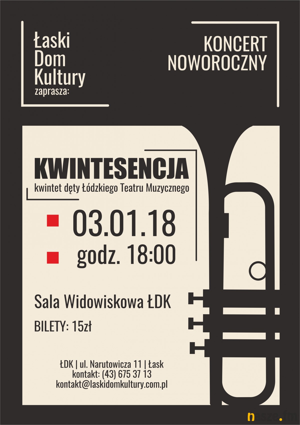 Łaski Dom Kultury zaprasza na Koncert Noworoczny w wykonaniu kwintetu dętego Łódzkiego Teatru Muzycznego "Kwintesencja". Koncert zaplanowano na środę, 3 stycznia.