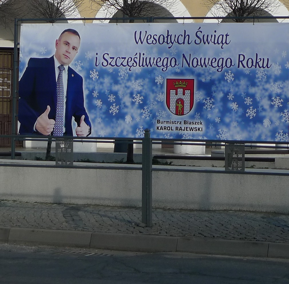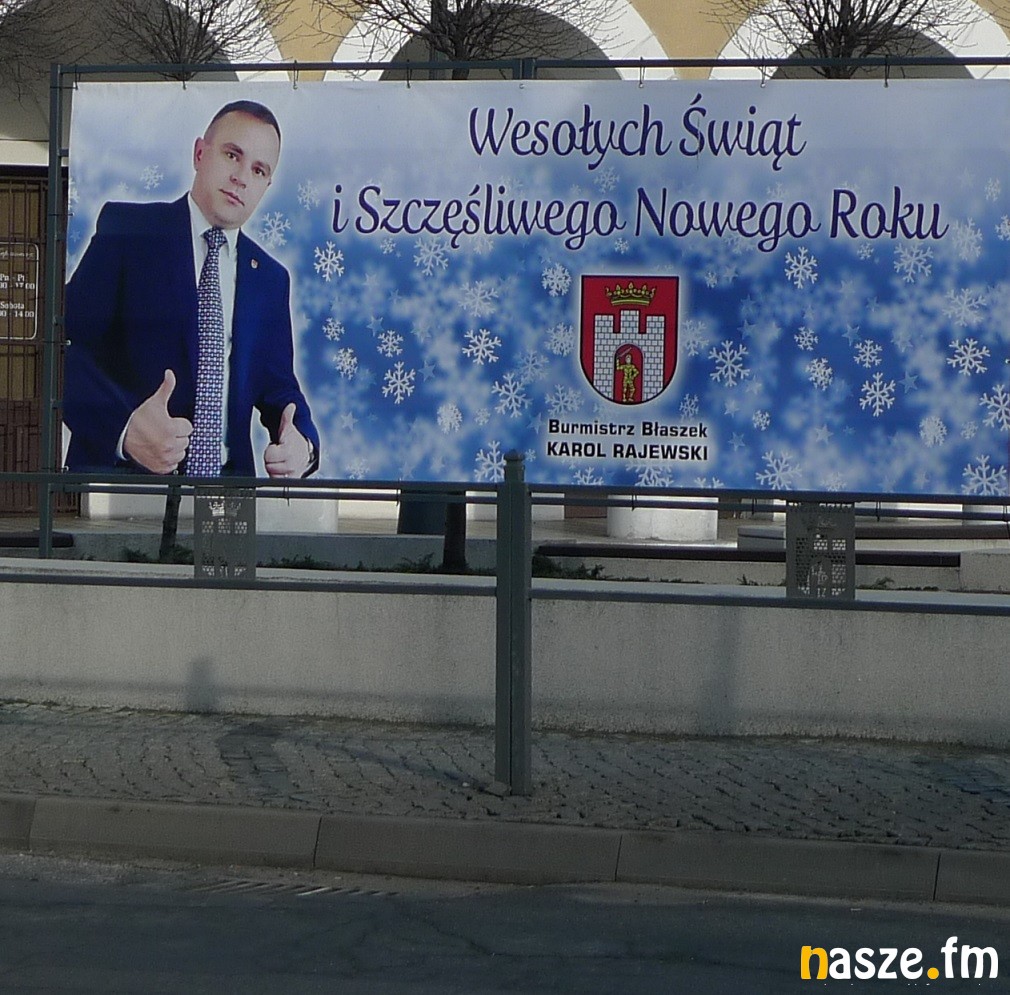 Życzenia mieszkańcom w formie bilbordu składa także burmistrz Błaszek Karol Rajewski.
