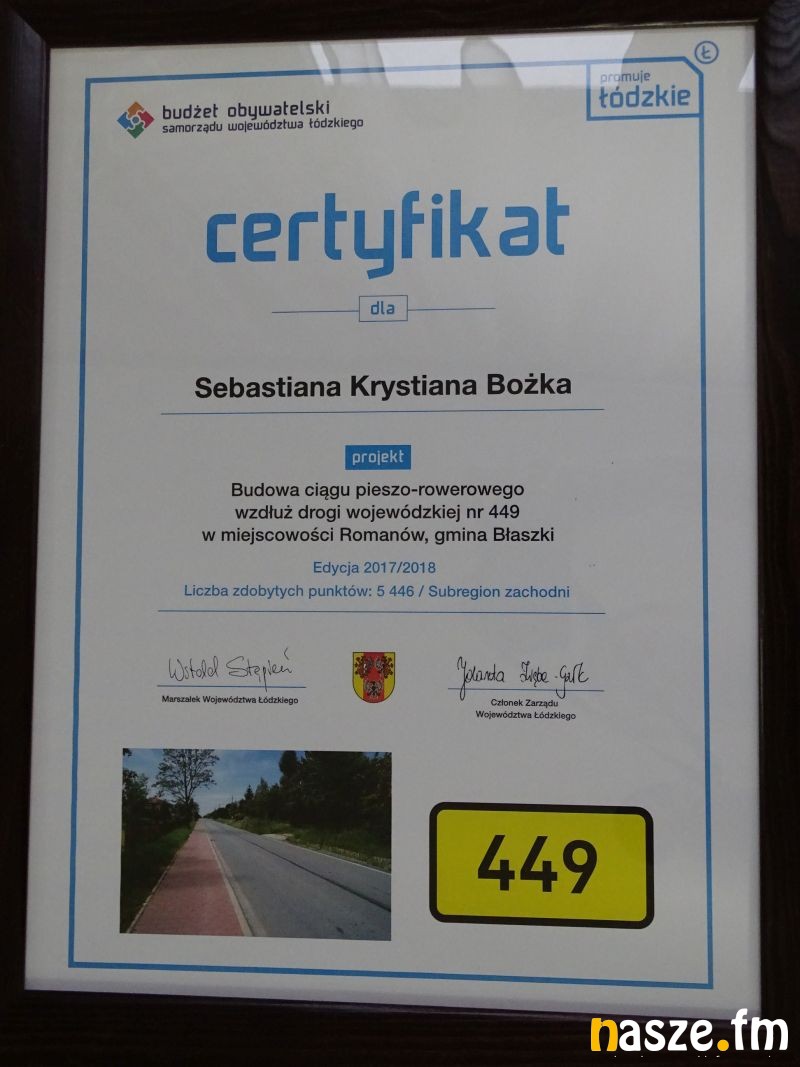 Nowy chodnik w Romanowie - to jeden z dwóch projektów z powiatu sieradzkiego, które zostaną zrealizowane w ramach budżetu obywatelskiego województwa łódzkiego. Marszałek Witold Stępień przekazał dziś stosowny certyfikat pomysłodawcy projektu Sebastianowi Bożkowi.