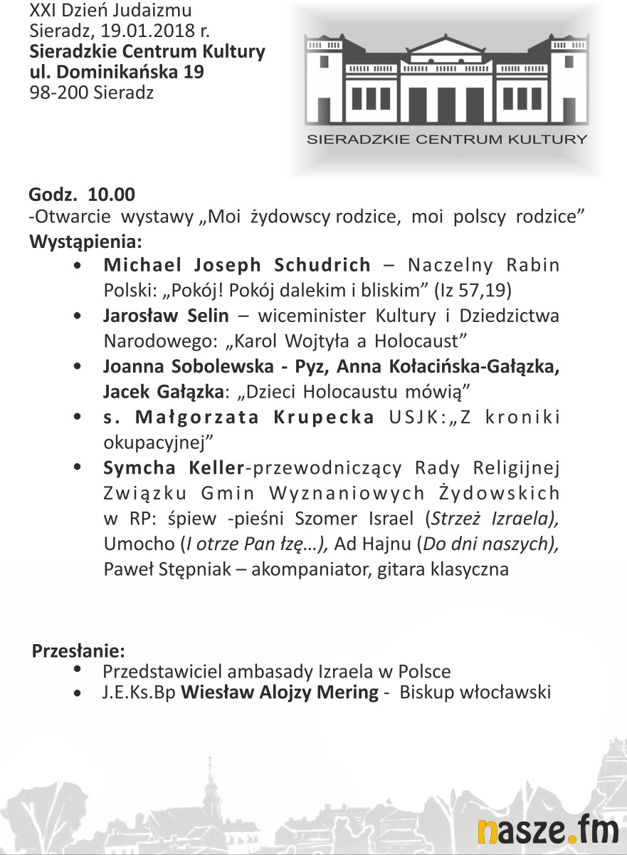 Z okazji Dnia Judaizmu do Sieradza przyjedzie m.in. Naczelny Rabin Polski Michael Joseph Schudrich, biskup włocławski Alojzy Mering, przedstawiciel Ambasady Izraela w Polsce, przewodniczący Rady Religijnej Związku Gmin Wyznaniowych Żydowskich w RP Symcha Keller oraz Jarosław Selin, wiceminister Kultury i Dziedzictwa Narodowego.