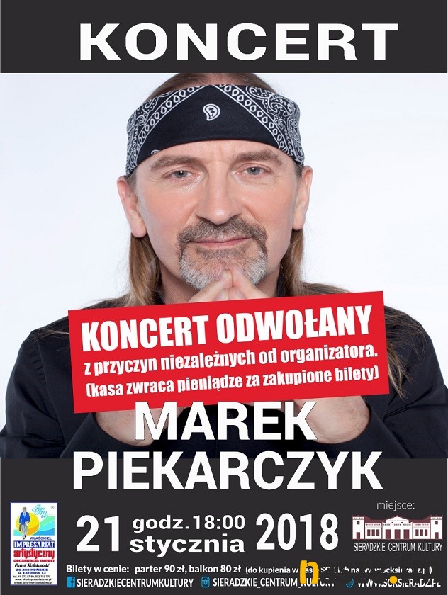 Zaplanowany na niedzielę 21 stycznia koncert Marka Piekarczyka został odwołany. Artysta miał wystąpić w Teatrze Miejskim w Sieradzu.