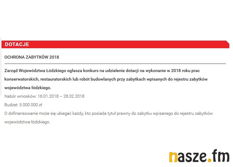Zarząd Województwa Łódzkiego ogłosił konkurs na udzielenie dotacji na wykonanie w 2018 roku prac konserwatorskich, restauratorskich lub robót budowlanych przy zabytkach wpisanych do rejestru zabytków województwa łódzkiego. Przeznaczono na to kwotę 5 milionów złotych.