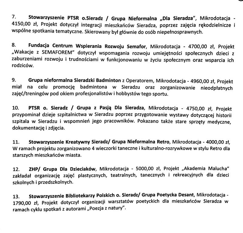- Mikrogranty w mojej ocenie są ogromnym sukcesem roku ubiegłego. 50 tysięcy złotych, które trafiło do rożnych organizacji pozarządowych, ale również i mieszkańców. Działania prowadzone w ramach mikrograntów zakończyły się wielkim sukcesem, sieradzanie dla sieradzan bardzo dużo zrobili. A my jako miasto mogliśmy w nim uczestniczyć w niedużej mierze finansowo, z czego się ogromnie cieszę - mówi Paweł Osiewała, prezydent Sieradza.