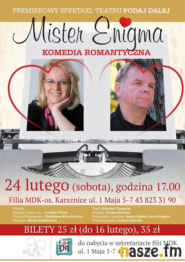 Filia Miejskiego Domu Kultury w Karsznicach zaprasza na spektakl "Mister Enigma". Ta komedia romantyczna 24 lutego.