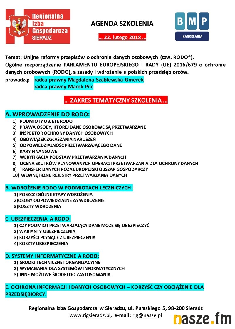 - Będzie to szkolenie dedykowane dla podmiotów leczniczych, które na co dzień przetwarzają dane osobowe pacjentów, pracowników czy kontrahentów. Osoba, która weźmie udział w tym szkoleniu uzyska informacje na temat zmieniającego się prawa, które wejdzie w życie od maja tego roku. Chodzi o ustawę o ochronie danych osobowych tzw. RODO. Podczas szkolenia zostaną przekazane szczegółowe informacje techniczne, które będą przydatne w codziennej pracy i analizie wszystkich spraw związanych z ochroną danych osobowych - mówi Sławomir Balcerzak, prezes Regionalnej Izby Gospodarczej w Sieradzu.