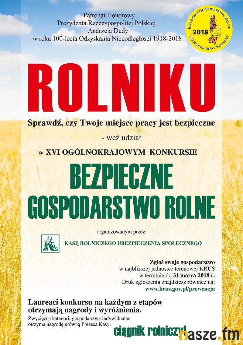 Zgłoszenia do konkursu można dokonać do 31.03.2018 r. w każdej Placówce Terenowej KRUS. W Konkursie mogą brać udział osoby pełnoletnie, prowadzące produkcyjną działalność rolniczą, ubezpieczone w KRUS (przynajmniej jeden z właścicieli gospodarstwa).