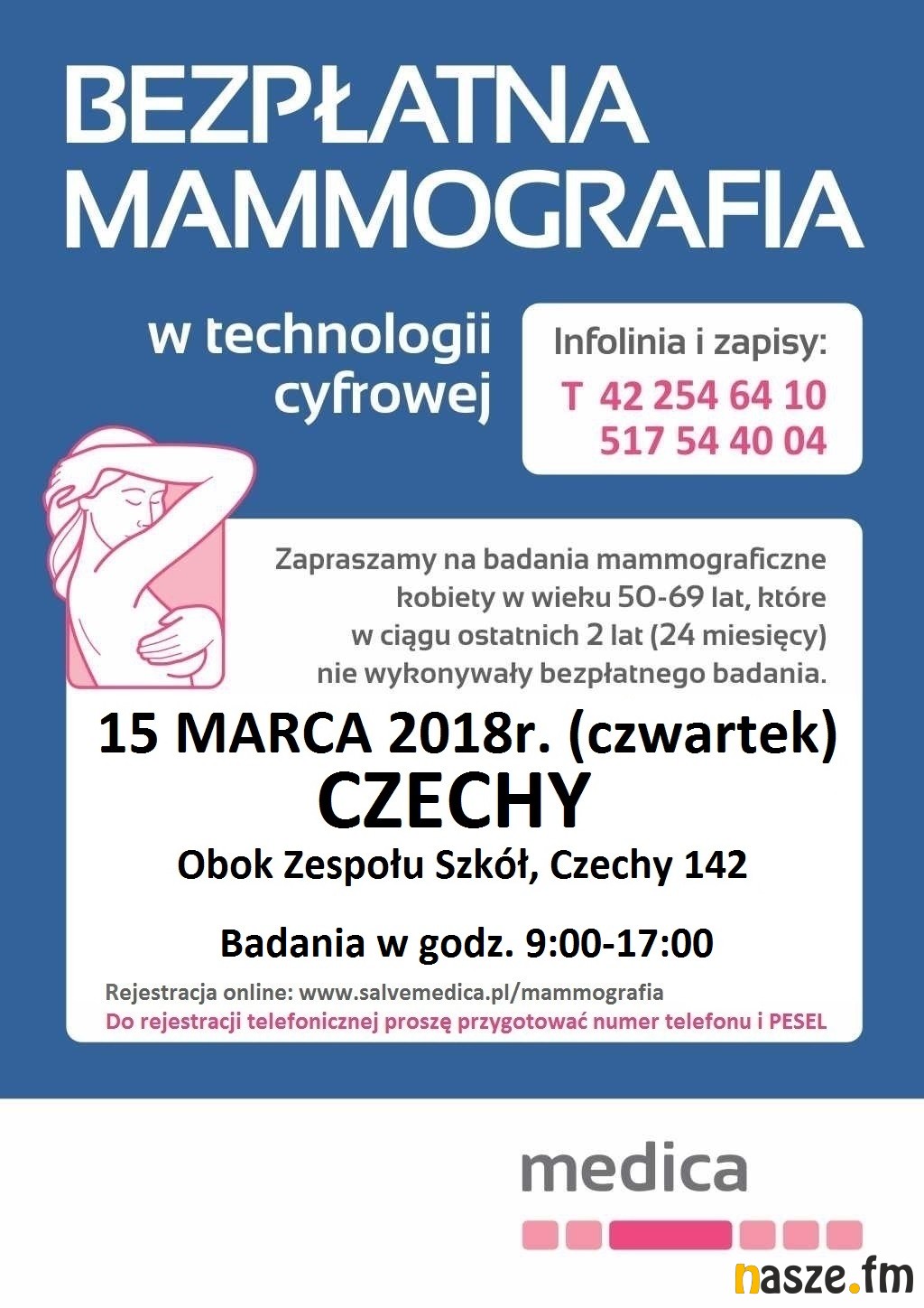 15 marca (czwartek) w godzinach 9.00-17.00 przy Zespole Szkół w Czechach odbędą się bezpłatne badania mammograficzne. Do badania uprawnione są kobiety w wieku od 50 do 69 roku życia, które w ciągu ostatnich 2 lat nie korzystały z bezpłatnej profilaktyki.
