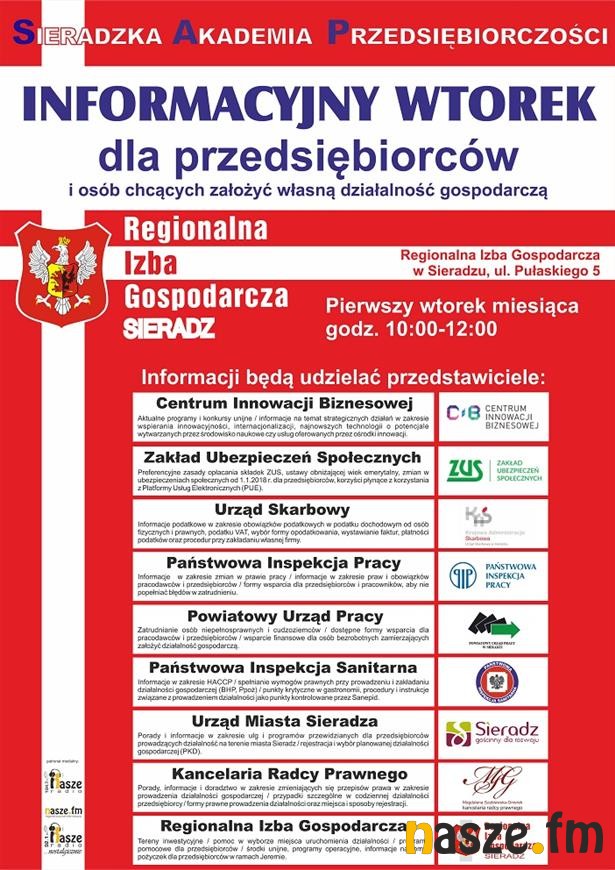 W najbliższy wtorek w Regionalnej Izbie Gospodarczej w Sieradzu odbędzie się kolejne spotkanie informacyjne dla przedsiębiorców i osób chcących założyć własną działalność gospodarczą. W jednym miejscu spotka się dziewięciu przedstawicieli instytucji działających na terenie powiatu sieradzkiego, którzy będą udzielać informacji w zakresie prowadzonej działalności.
