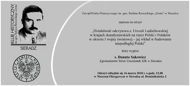 Z kolei w piątek 16 marca Zarząd Klubu Historycznego im. gen. Stefana Roweckiego "Grota" w Sieradzu zaprasza na odczyt "Działalność odczytowa s. Urszuli Ledóchowskiej w krajach skandynawskich na rzecz Polski i Polaków w okresie I wojny światowej - jej wkład w budowanie niepodległej Polski", który wygłosi s. Danuta Sakowicz ze Zgromadzenia Sióstr Urszulanek w Sieradzu. Wykład rozpocznie się w południe w budynku przy. Dominikańskiej 2.