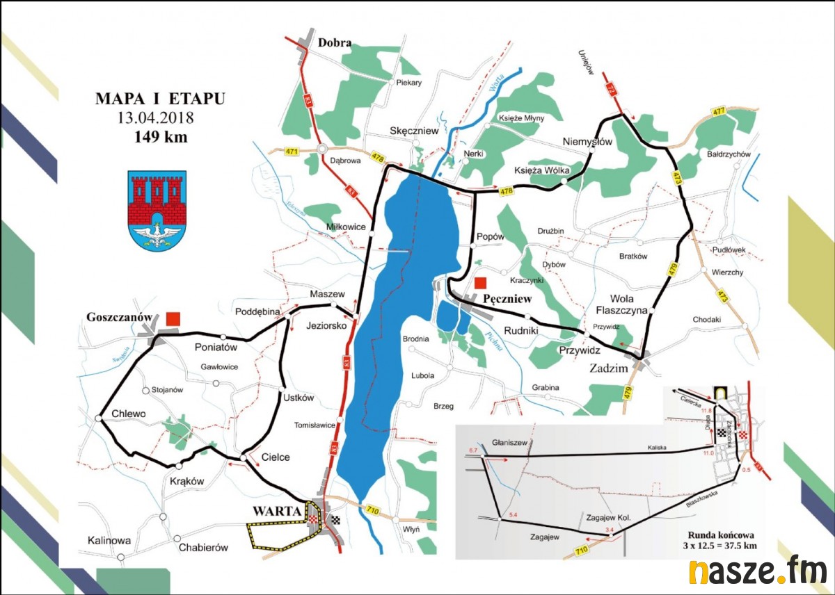 33. Ogólnopolski Wyścig Kolarski Szlakiem Bursztynowym Hellena Tour I etap Warta - Warta (148 km) Trasa: Warta– Goszczanów I Premia (19 km)– Jeziorsko – Miłkowice – Kolonia Strachocice – DW.4 78 – Niemysłów – Krępa – Porczyny – Zadzim - Pęczniew II premia (75 km) – Jeziorsko – Strachanów – Cielce – Warta III premia (111km) + 3 Rundy po 12,4 km (ul. Zachodnia – Przedwiośnie - Świętojańska – Błaszkowska - Zagajew – Głaniszyn – Warta ul. Kaliska – Długa – Racławicka - Cielecka - Zachodnia) Program etapu: 13.50 – prezentacja ekip startujących w wyścigu w Warcie ul. Zachodnia 14.30 – start w Warcie ul. Zachodnia 18.00 – meta etapu w Warcie ul. Zachodnia