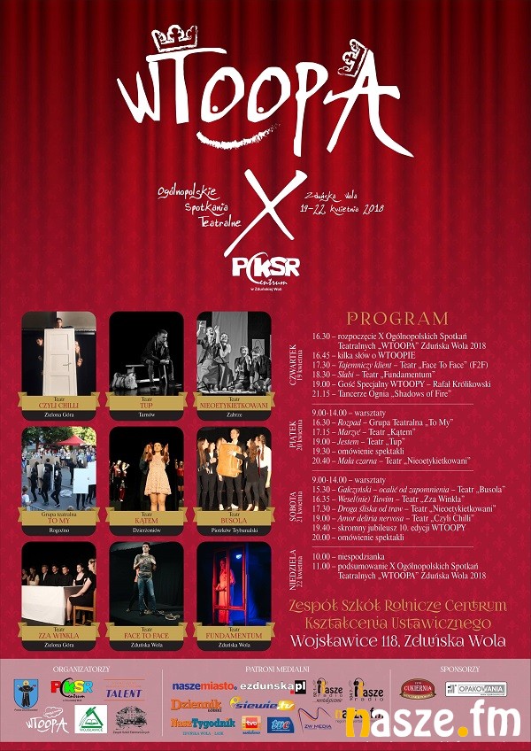 - 16.30 - oficjalne rozpoczęcie X Ogólnopolskich Spotkań Teatralnych „WTOOPA” Zduńska Wola 2018