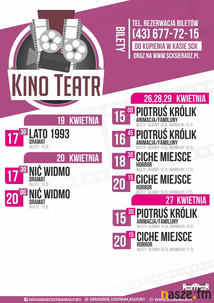 Od 19 kwietnia w sieradzkim Kinie Teatr, będzie można obejrzeć kolejne nowości filmowe. Wśród nich m.in. familijny film "Piotruś Królik", czy horror "Ciche miejsce". Więcej szczegółów na plakacie.
