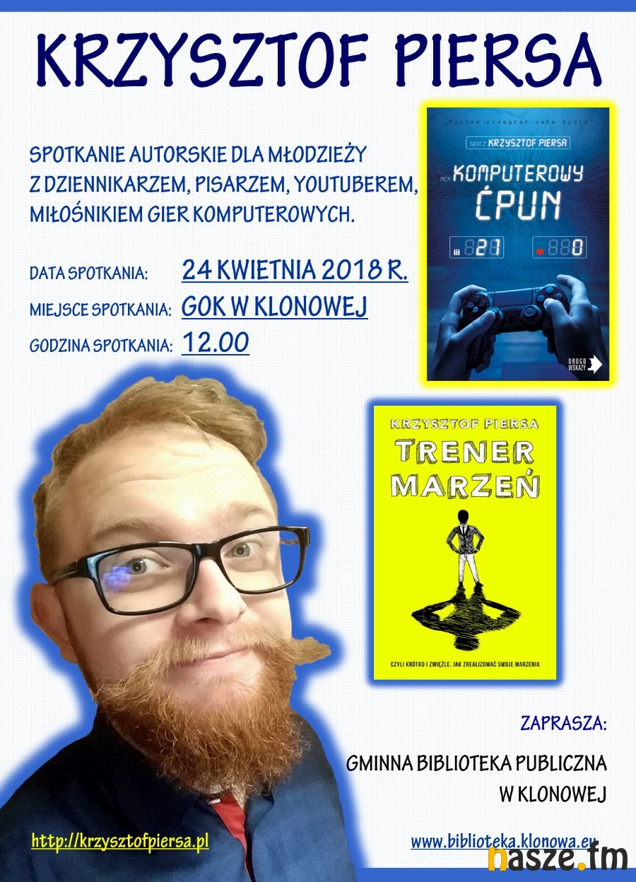 Dziś, w Gminnym Ośrodku Kultury w Klonowej, odbędzie się spotkanie autorskie z youtuberem i dziennikarzem, Krzysztofem Piersą. Spotkanie adresowane jest do młodzieży, ale nie tylko.