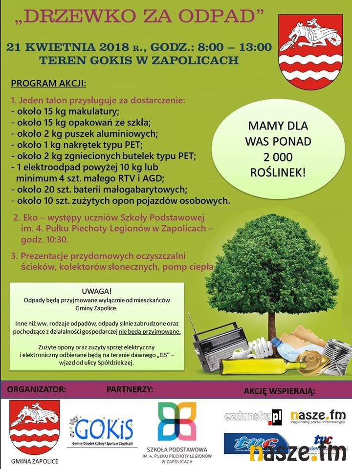 W zamian za przyniesione odpady mieszkańcy otrzymają sadzonki roślin. Mowa o akcji ekologicznej "Drzewko za odpad", która jutro (21.04) odbędzie się w Zapolicach.