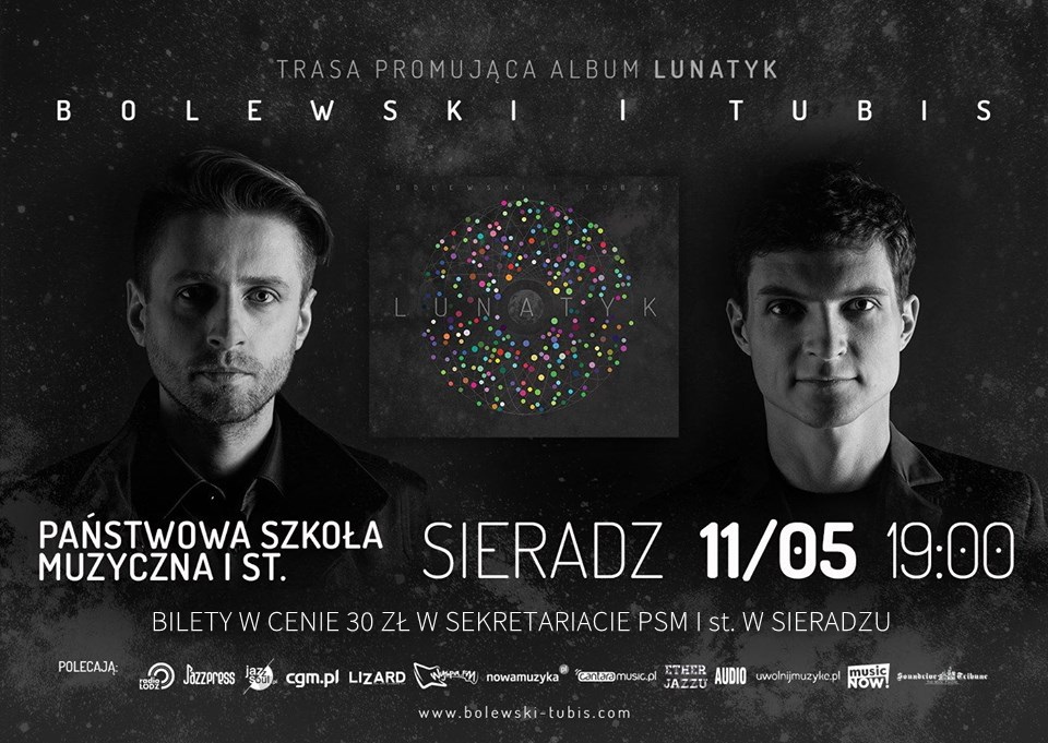 Z kolei w piątkowy wieczór 11 maja 2018 r. o godzinie 19:00 rozpocznie się się koncert duetu Bolewski/Tubis. Wizyta muzyków w Sieradzu wpisuje się w ogólnopolską trasę koncertową promującą album "Lunatyk".