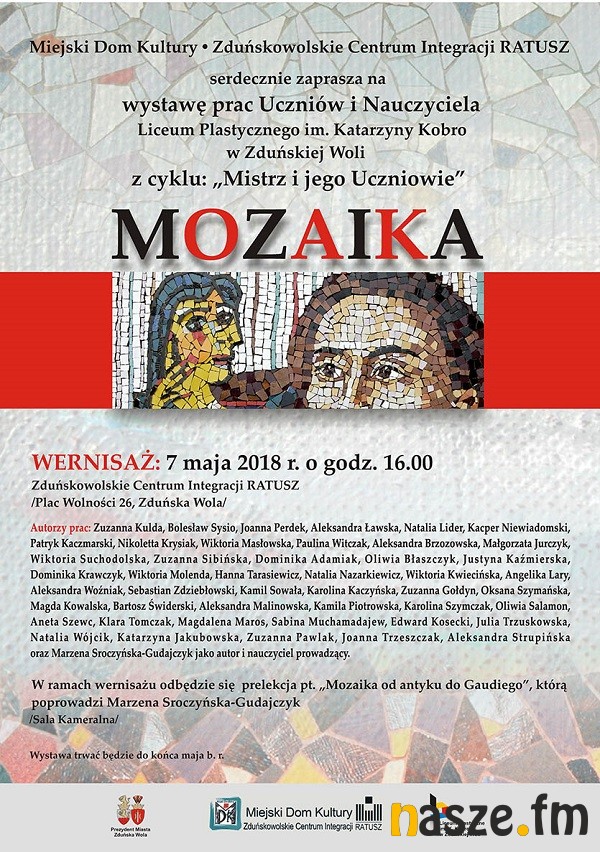 Miejski Dom Kultury Zduńskowolskie Centrum Integracji Ratusz zapraszają na wystawę prac uczniów i nauczyciela Liceum Plastycznego im. Katarzyny Kobro z cyklu: "Mistrz i jego Uczniowie" pt: "Mozaika".