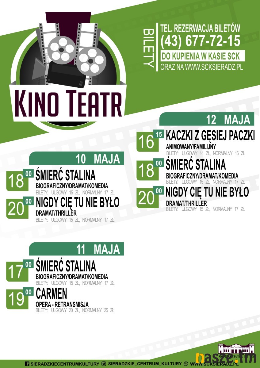 Kino Teatr w Sieradzu, zaprasza od 10 maja, na kolejne nowości filmowe m.in: film biograficzny " Śmierć Stalina" czy dramat "Nigdy Cię tu nie było". Szczegóły na plakacie.