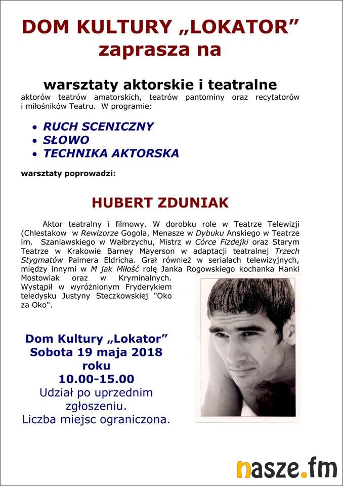 Dom Kultury "Lokator" organizuje warsztaty aktorskie i teatralne. Poprowadzi je aktor teatralny i telewizyjny Hubert Zduniak.