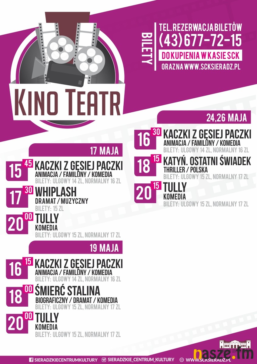 W artykule znajdziecie propozycje kinowe Sieradzkiego Centrum Kultury, które będę wyświetlane w ciągu najbliższych dwóch tygodni. Wśród nich komedia "Tully", animacja "Kaczki z gęsiej paczki" czy produkcja "Whiplash", która będzie kolejną odsłoną "Innych horyzontów kina" w Sieradzu.