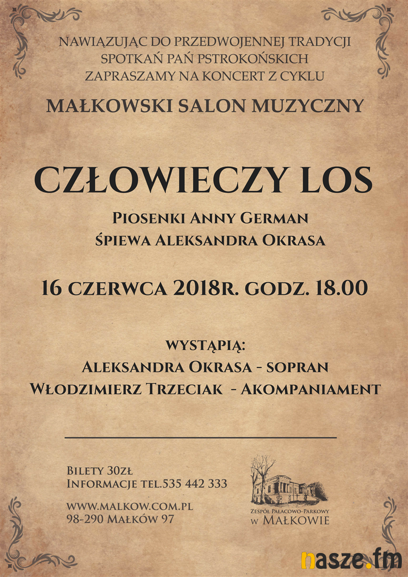 Bilety do zakupienia w Pałacu w Małkowie w cenie 30 zł - normalny, 15 zł- ulgowy (młodzież szkolna).