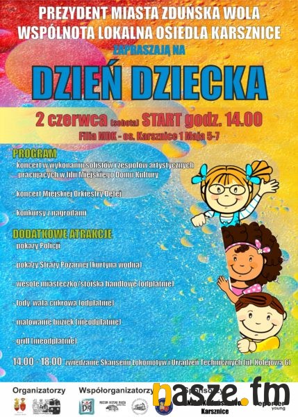Wielkimi krokami zbliża się Dzień Dziecka. W piątek (01.06) liczne atrakcje dla najmłodszych szykuje Zduńskowolskie Centrum Integracji – Ratusz, natomiast w sobotę (02.06) festyn z okazji Dnia Dziecka odbędzie się na osiedlu Karsznice.