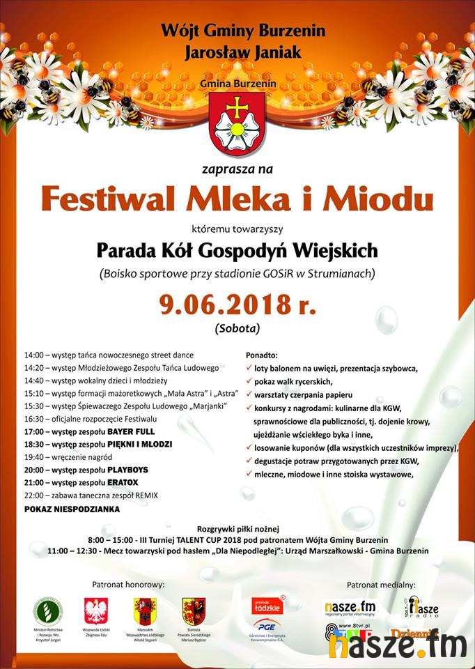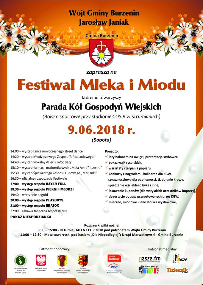 - Bardzo serdecznie zapraszam do udziału w Festiwalu Mleka i Miodu, który jak co roku odbędzie się na boisku przy stadionie Gminnego Ośrodka Sportu i Rekreacji w Strumianach. Będziemy gościć same gwiazdy muzyki disco polo, zagrają dla nas: Bayer Full, Piękni i Młodzi, Playboys i Eratox. Nie zabraknie smakołyków, które będą prezentować koła gospodyń wiejskich podczas tradycyjnej parady. Oprócz tego przygotowaliśmy wiele atrakcji, wśród nich: lot balonem na uwięzi, prezentacja szybowca, walki rycerskie, warsztaty czerpania papieru. Będą też konkursy na ujeżdżanie byka czy dojenie krowy, jestem przekonany, że tutaj każdy znajdzie coś dla siebie – zapowiada Jarosław Janiak, wójt gminy Burzenin.