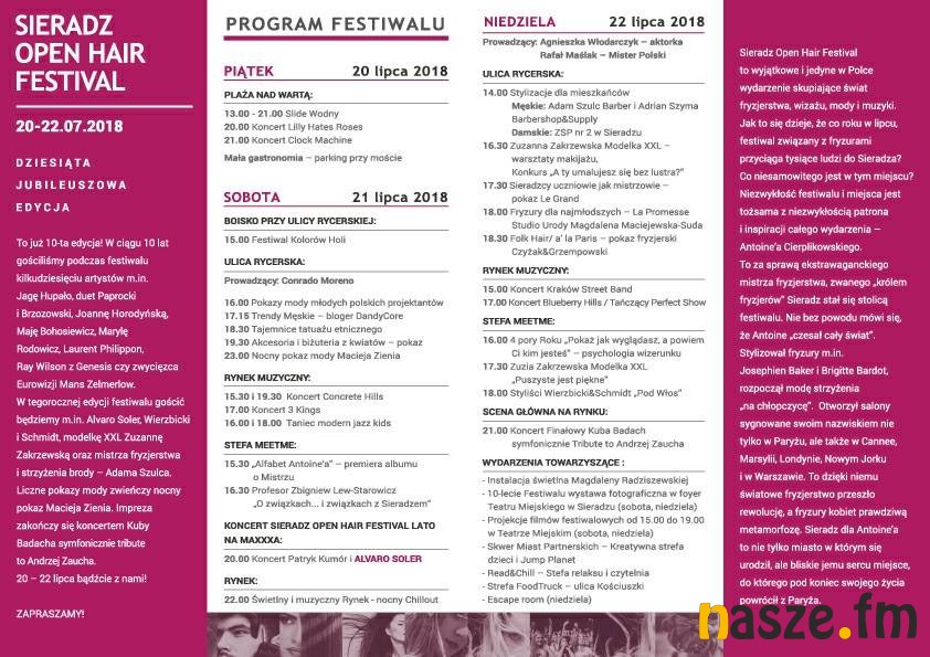 Alvaro Soler, Kuba Badach, Patryk Kumór, Concrete Hills, 3 Kings, Kraków Street Band, Lilly Hates Roses czy Clock Machine - to muzyczna odsłona tegorocznego festiwalu. Podczas nocnego pokazu swoją kolekcję zaprezentuje Maciej Zień, a o fryzjerstwie będzie opowiadał duet Wierzbicki i Schmidt. Podczas 10. edycji festiwalu odbędzie się także premiera albumu o Cieplikowskim. Sieradz Open Hair Festival potrwa od 20 do 22 lipca. Dziś we Wrocławiu w pracowni duetu Wierzbicki i Schmidt, miała miejsce konferencja prasowa dotycząca tego wydarzenia.