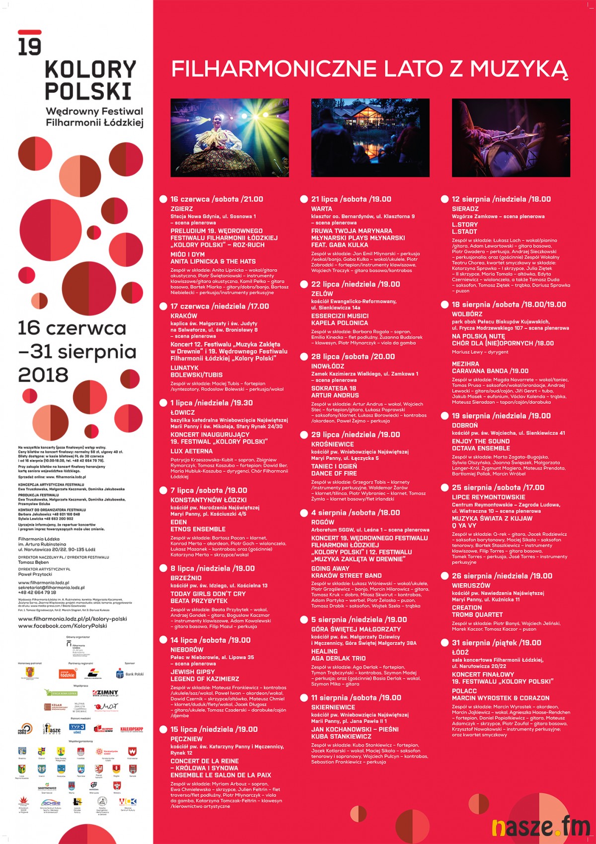 - Bardzo cieszę się, że już po raz 19. możemy w okresie wakacji zaprosić melomanów do podążania koncertowym szlakiem - mówi Tomasz Bęben, Dyrektor Naczelny Filharmonii Łódzkiej. - W zeszłym roku festiwal „Kolory Polski” osiągnął pełnoletniość, więc pod względem organizacyjnym jesteśmy dojrzali, mamy duże doświadczenie. Teraz działamy z większym rozmachem niż kilkanaście lat temu, więc przygotowaliśmy mnóstwo muzycznych niespodzianek, którymi chcemy się podzielić ze słuchaczami. Jestem przekonany, że w różnorodnym repertuarze każdy odbiorca znajdzie koncert odpowiadający jego potrzebom i oczekiwaniom, a letnie muzyczne „wędrówki” pozwolą ich uczestnikom zgromadzić wiele dobrej energii na kolejne, chłodniejsze miesiące – dodaje Tomasz Bęben.