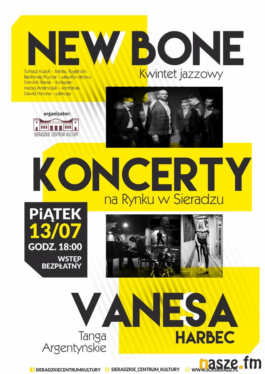 W piątek 13 lipca wystąpi kwintet jazzowy New Bone. Gwiazdą wieczoru będzie Vanessa Herbec, pochodząca z Argentyny wokalistka, gitarzysta i trębaczka. Początek koncertu o godz. 18:00, wstęp wolny. W programie m.in. tanga argentyńskie.