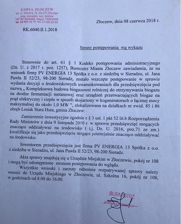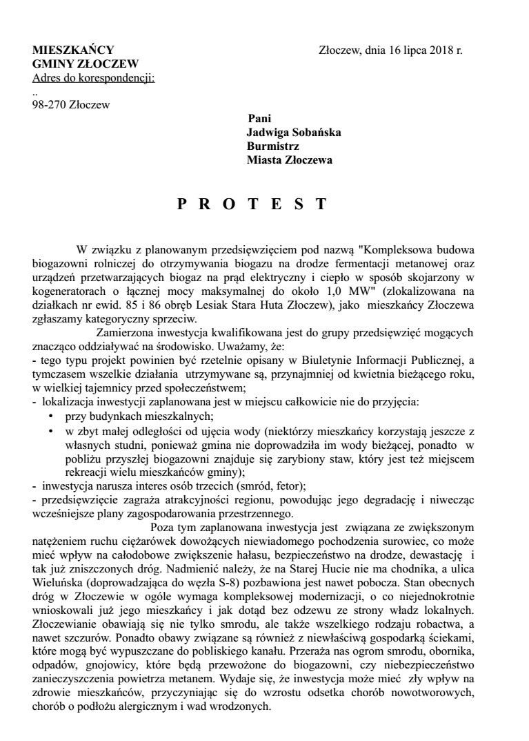 Mieszkańcy gminy Złoczew rozpoczęli protest w związku z powstaniem biogazowni. W piśmie skierowanym do Jadwigi Sobańskiej zgłaszają swój niepokój.