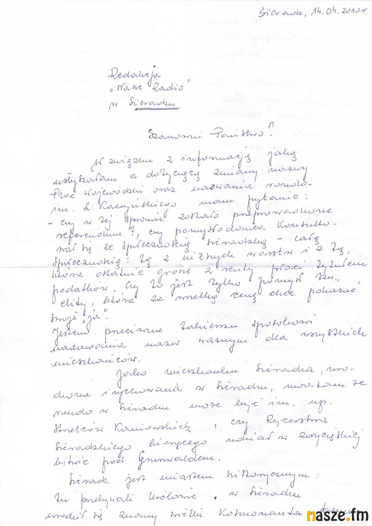 Do naszej redakcji dotarło pismo od mieszkanki Sieradza. Wyraża w nim ubolewanie z powodu braku konsultacji tego pomysłu z mieszkańcami miasta. Autorka pisma sprzeciwia się pochopnemu nadaniu imienia Lecha Kaczyńskiego obiektom na terenie Sieradza.