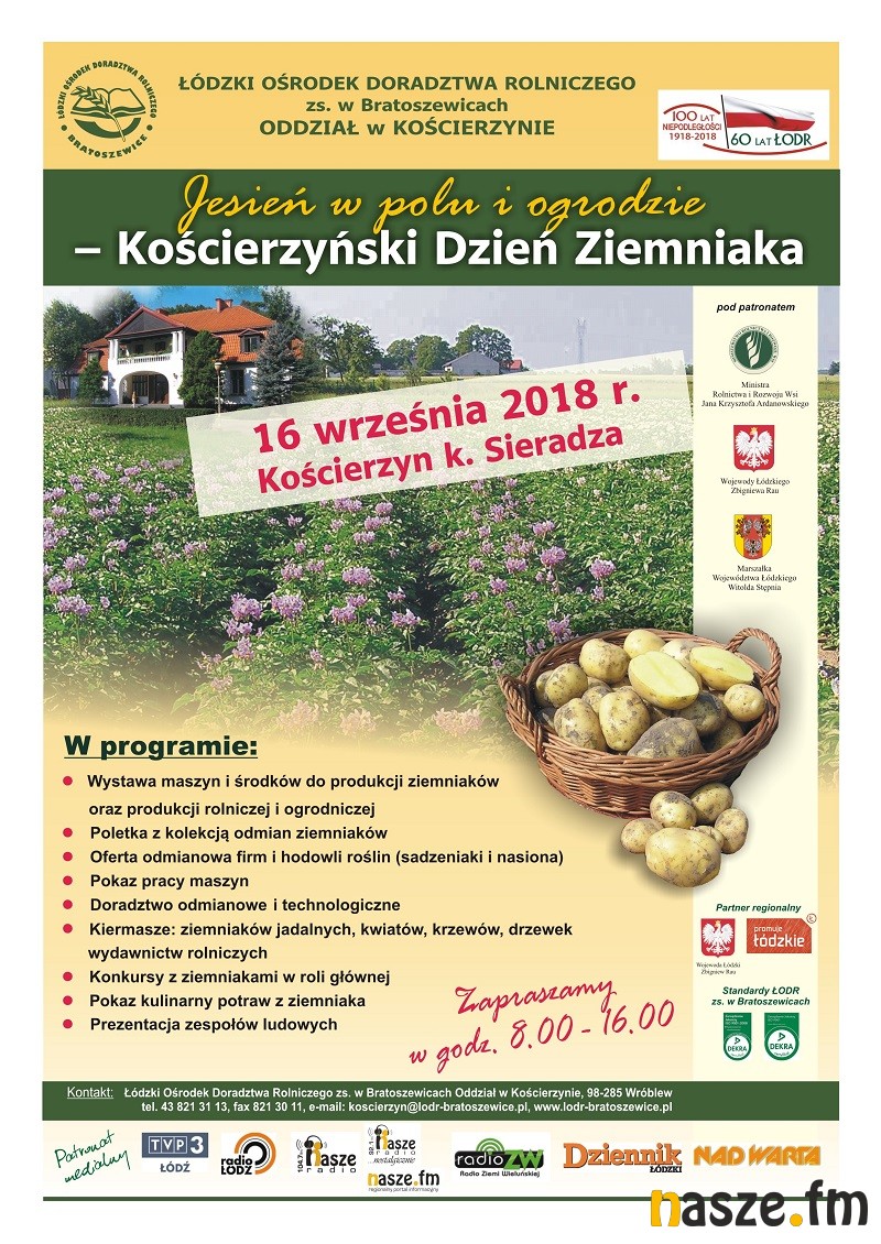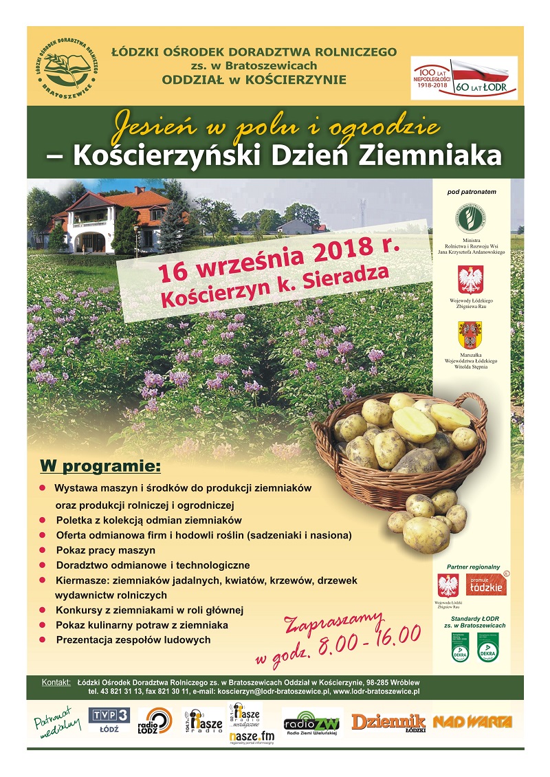 Po raz kolejny w Kościerzynie 16 września spotkają się rolnicy, konsumenci i sympatycy rolnictwa szczególnie zainteresowani technologią uprawy i wykorzystaniem ziemniaków. Tutaj na terenach wystawowych w Oddziale w Kościerzynie i sąsiadujących polach, Łódzki Ośrodek Doradztwa Rolniczego z siedzibą w Bratoszewicach organizuje targi pod nazwą Jesień w polu i ogrodzie – Kościerzyński Dzień Ziemniaka.