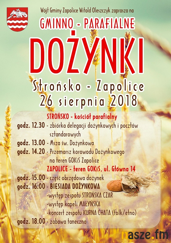 W najbliższą niedzielę (26.08) za plony dziękować będą rolnicy z Gminy Zapolice i parafii Strońsko. Dożynki tradycyjnie rozpoczną się od mszy świętej w kościele parafialnym w Strońsku, a część obrzędowa odbędzie się na terenie Gminnego Ośrodka Kultury i Sportu w Zapolicach.