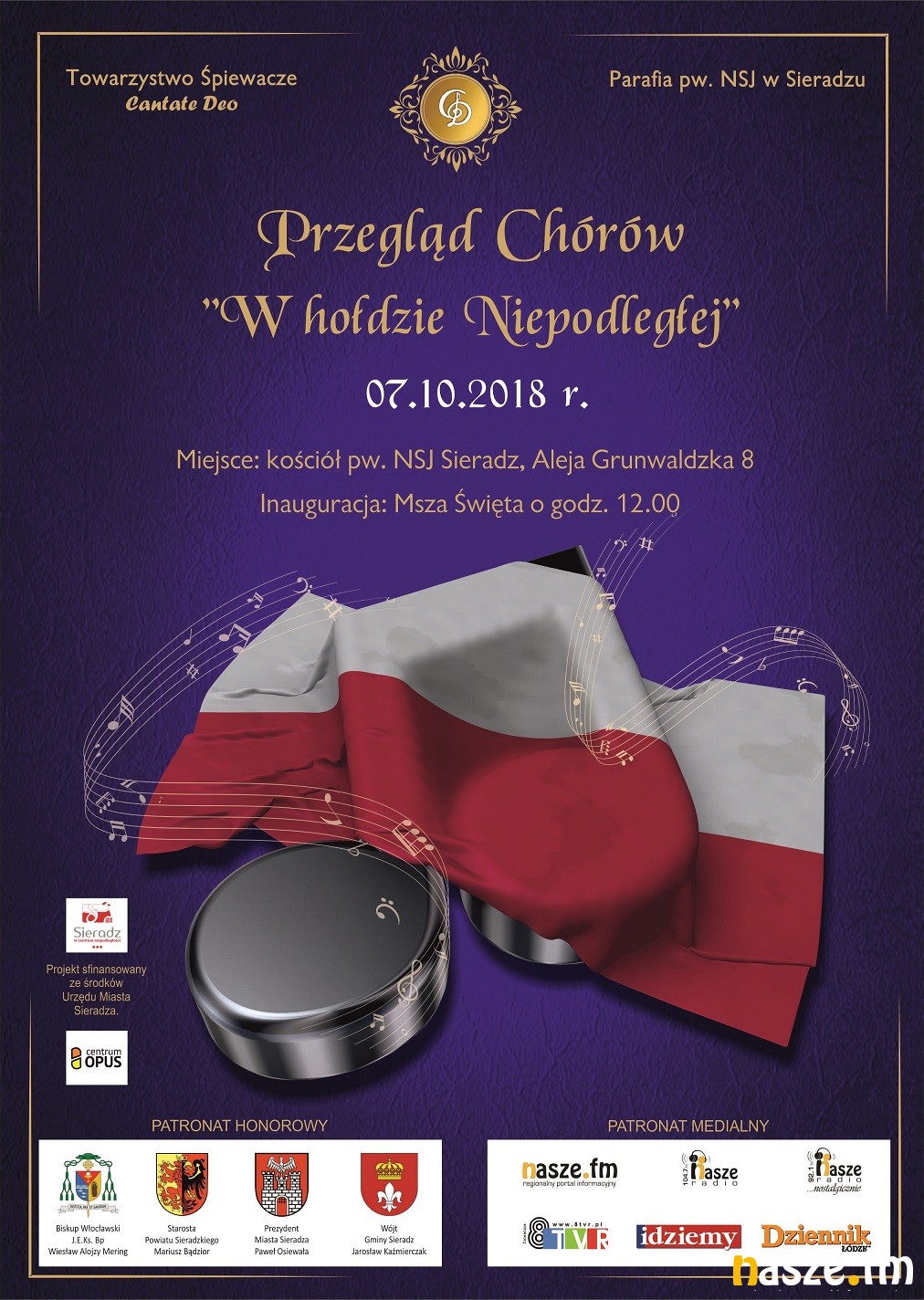 7 października w Kościele pw. Najświętszego Serca Jezusowego w Sieradzu odbędzie się I Przegląd Chórów " W hołdzie Niepodległej". W przeglądzie wezmą udział amatorskie chóry wielogłosowe z całego kraju.