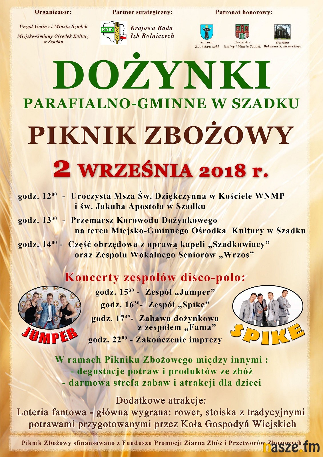 W tym roku dożynkom w Szadku towarzyszyć będzie też Piknik Zbożowy, sfinansowany z Funduszu Promocji Ziarna Zbóż i Przetworów Zbożowych. W ramach pikniku zorganizowane zostaną m.in. degustacje potraw i produktów ze zbóż oraz darmowa strefa zabaw i atrakcji dla dzieci.