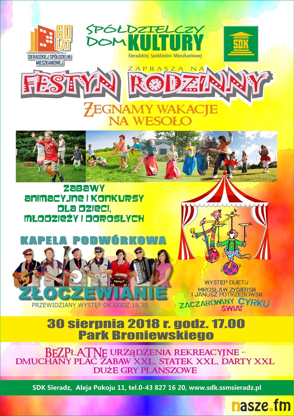 Spółdzielczy Dom Kultury w Sieradzu zaprasza dziś na festyn rodzinny z okazji zakończenia wakacji. Nie zabraknie wspólnych zabaw animacyjnych i konkursów dla dzieci i młodzieży. Festyn jest okazją do wspólnej integracji całych rodzin. Szczegóły na plakacie.