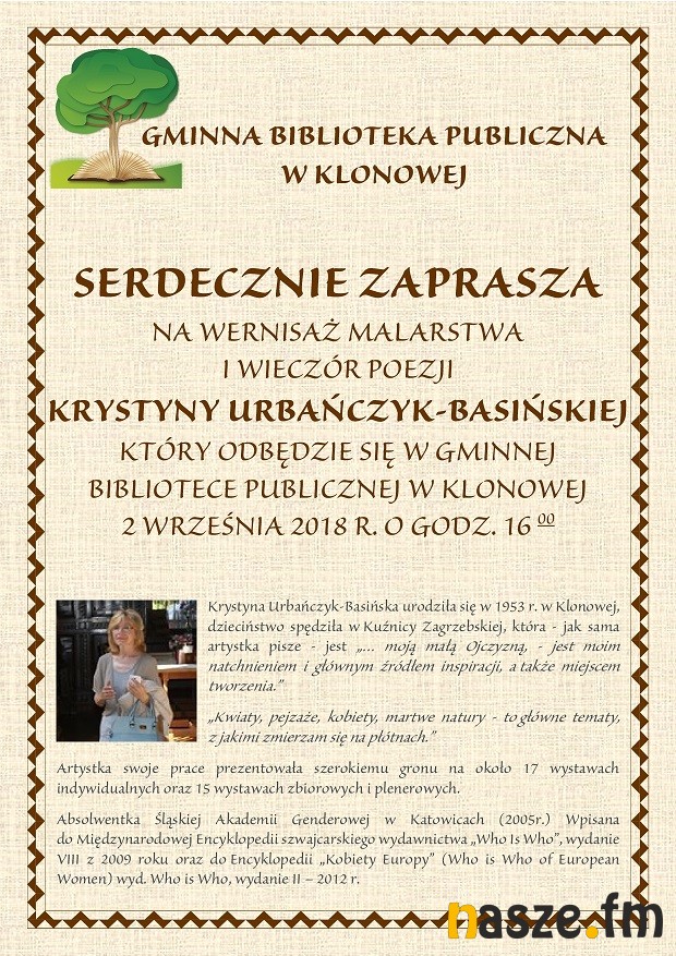 Gminna Biblioteka Publiczna w Klonowej zaprasza w najbliższą niedzielę na spotkanie autorskie z Krystyną Urbańczyk- Basińską. Artystka zaprezentuje swoje prace i odczyta fragmenty swojej poezji. Wystawę będzie można oglądać do 14 września.