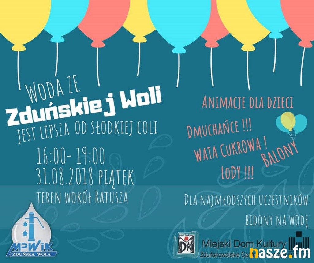 Zduńskowolskie Centrum Integracji - Ratusz zaprasza na dwa wydarzenia z okazji kończących się wakacji. W najbliższy piątek (31.09) na najmłodszych czekać będą liczne atrakcje podczas happeningu "Woda w Zduńskiej Woli jest lepsza od słodkiej coli". Zaplanowano też zabawę taneczną z kapelą "Webry".