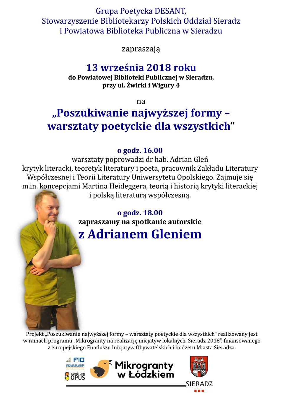 Spotkanie organizują: Grupa Poetycka DESANT, Stowarzyszenie Bibliotekarzy Polskich Oddział Sieradz i Powiatowa Biblioteka Publiczna w Sieradzu. Zajęcia, które Adrian Gleń poprowadzi - "Poszukiwanie najwyższej formy - warsztaty poetyckie dla wszystkich" rozpoczną się o godz.16:00. Na godz. 18:00 zaplanowano spotkanie autorskie z poetą.