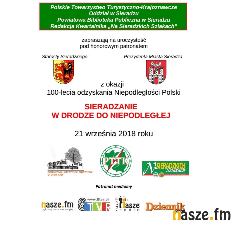 O 10 w sali C Starostwa Powiatowego w Sieradzu rozpocznie się konferencja „Sieradzanie w drodze do Niepodległej". W programie: