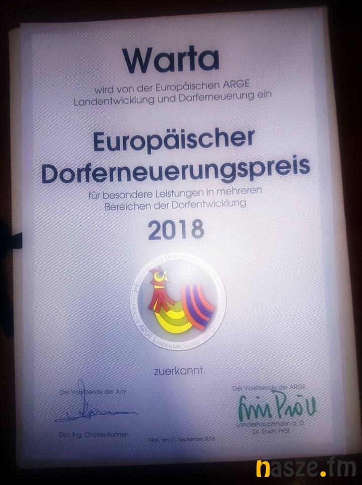 - Europejskie Stowarzyszenie Rozwoju Obszarów Wiejskich i Odnowy wsi ARGE przyznało Gminie i Mieście Warta prestiżowe wyróżnienie. Konkurs o Europejską Nagrodę Odnowy Wsi jest kierowany intencją, aby nagrodzić szczególnie wyróżniające się i wzorcowe procesy rozwoju i odnowy w wiejskiej społeczności, uwzględniając przy tym ich kontekst ekonomiczny i kulturowy. Pomimo dużej konkurencji z całej Europy, tegoroczna nagroda trafiła do nas. Jest to zaszczyt, ale również uhonorowanie ciężkiej pracy całego Warckiego Samorządu i pracowników. Jest to również doskonała promocja całego regionu Łódzkiego - mówi Jan Serafiński, burmistrz Warty.