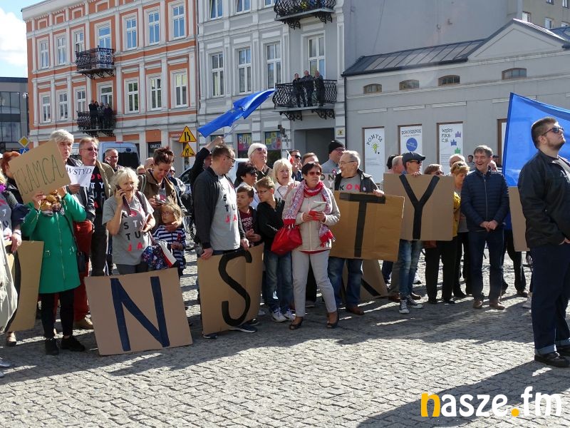 Na spotkaniu nie brakowało zwolenników partii rządzącej, ale też działaczy opozycji, którzy pojawili się z flagami UE oraz transparentami z napisami "Konstytucja".