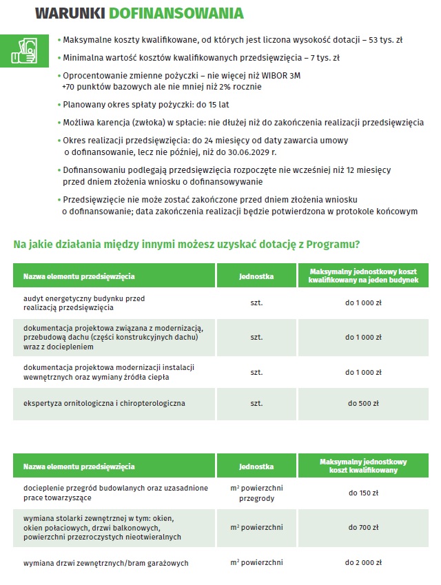 Korzystając z programu możecie uzyskać zwrot części poniesionych kosztów. Maksymalne koszty kwalifikowane przewidziane do wsparcia dotacyjnego wynoszą 53 tys. zł. Jeśli koszt realizacji inwestycji przekroczy tę kwotę, dodatkowe koszty mogą być dofinansowane w formie pożyczki. Minimalny koszt projektu to 7 tys. zł.