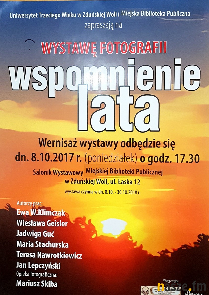 "Wspomnienie Lata" – to tytuł wystawy fotograficznej przygotowanej przez studentów Uniwersytetu Trzeciego Wieku w Zduńskiej Woli. Wernisaż jutro odbędzie się w Miejskiej Biblioteki Publicznej im. Jerzego Szaniawskiego.