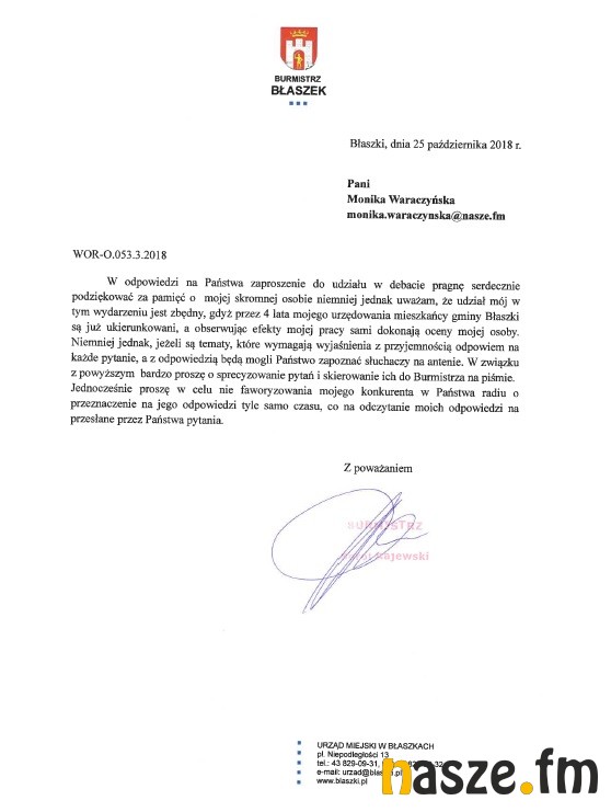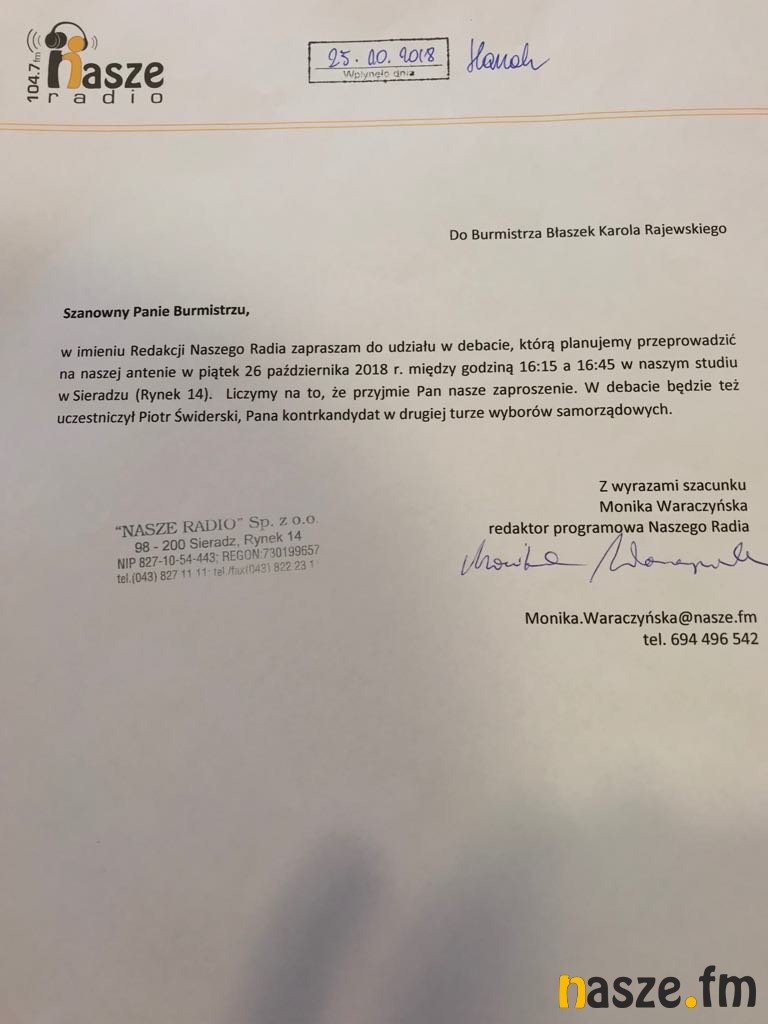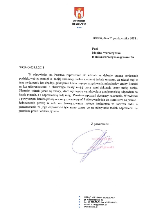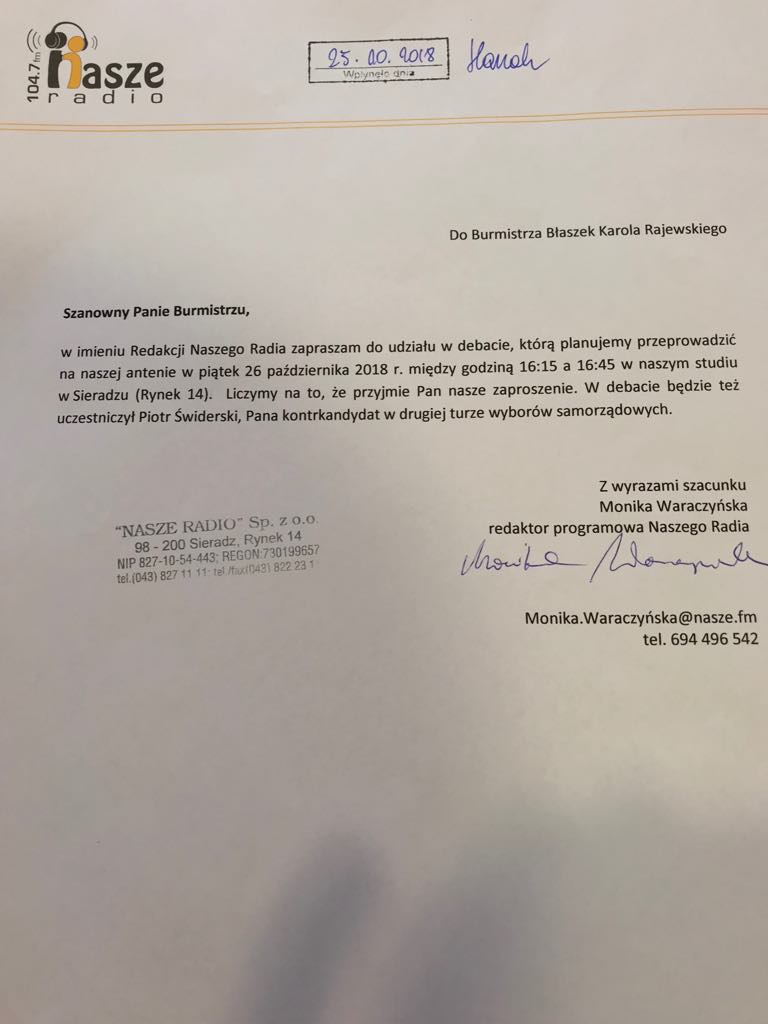 4. listopada odbędzie się druga tura wyborów samorządowych. Podczas pierwszej nie udało się rozstrzygnąć wyniku w gminie Błaszki. O fotel burmistrza powalczą Karol Rajewski oraz Piotr Świderski. Obu kandydatów zaprosiliśmy do udziału w radiowej debacie wyborczej. Początek dzisiaj po 16. Z naszego zaproszenia nie skorzystał Karol Rajewski.