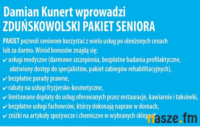 Damian Kunert w ramach projektu Senior Plus przygotował również ZDUŃSKOWOLSKI PAKIET SENIORA, gdzie największy nacisk położony jest na świadczenia medyczne. Pakiet pozwoli seniorom korzystać z wielu usług po obniżonych cenach lub za darmo. Wśród bonusów znajdują się: