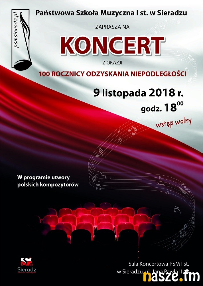 Uczniowie i nauczyciele Państwowej Szkoły Muzycznej I st. w Sieradzu zapraszają na koncert z okazji 100. rocznicy odzyskania przez Polskę niepodległości. Koncert rozpocznie się dziś o godz.18:00, wstęp wolny.