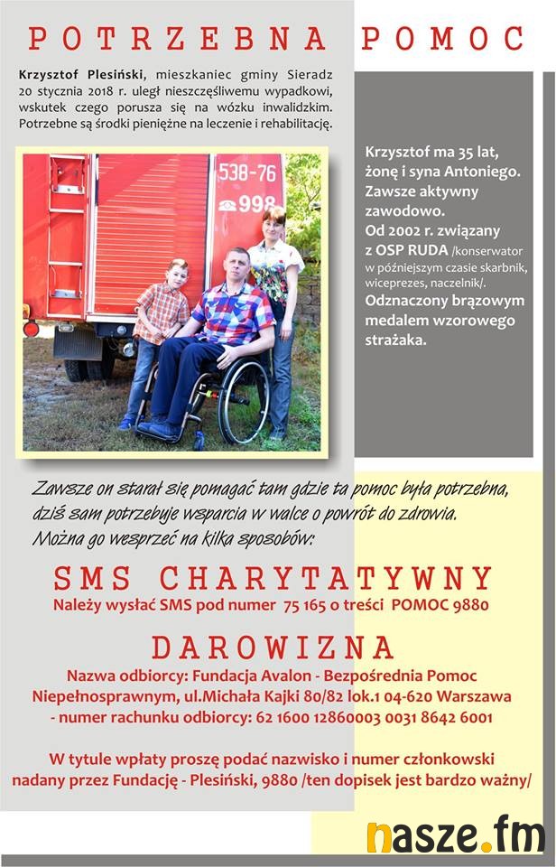 35-letni druh Krzysztof Plesiński z podsieradzkiej Rudy uległ w styczniu tego roku nieszczęśliwemu wypadkowi i niestety porusza się na wózku inwalidzkim. Jego leczenie i rehabilitacja są bardzo drogie.