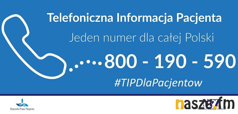 - 800 190 590 to dotychczasowy numer bezpłatnej ogólnopolskiej infolinii Rzecznika Praw Pacjenta. TIP- Telefoniczna Informacja Pacjenta będzie jednoczasowo obsługiwana przez kilkudziesięciu pracowników oddziałów wojewódzkich Funduszu oraz Biura Rzecznika Praw Pacjenta. Nowy jednolity numer w całym kraju zastępuje kilkanaście numerów funkcjonujących do tej pory w oddziałach wojewódzkich Funduszu. Gwarantuje on uzyskanie szybkiej, kompleksowej i przejrzystej informacji dotyczącej funkcjonowania systemu ochrony zdrowia w Polsce.