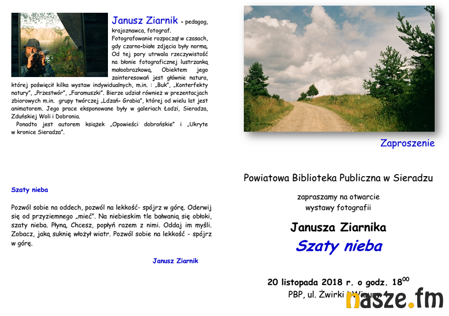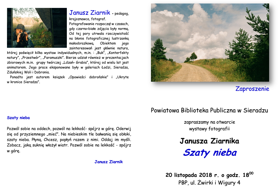 Powiatowa Biblioteka Publiczna w Sieradzu zaprasza jutro na otwarcie wystawy fotografii Janusza Ziarnika "Szaty nieba". Początek o godz. 18:00.